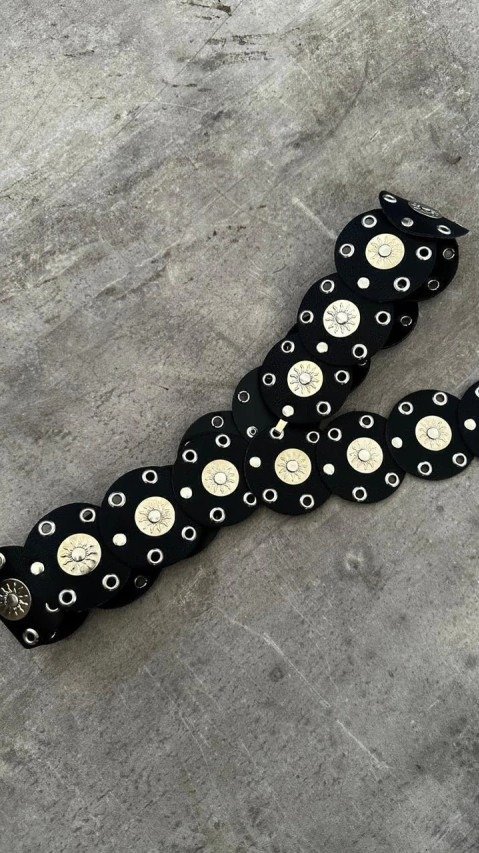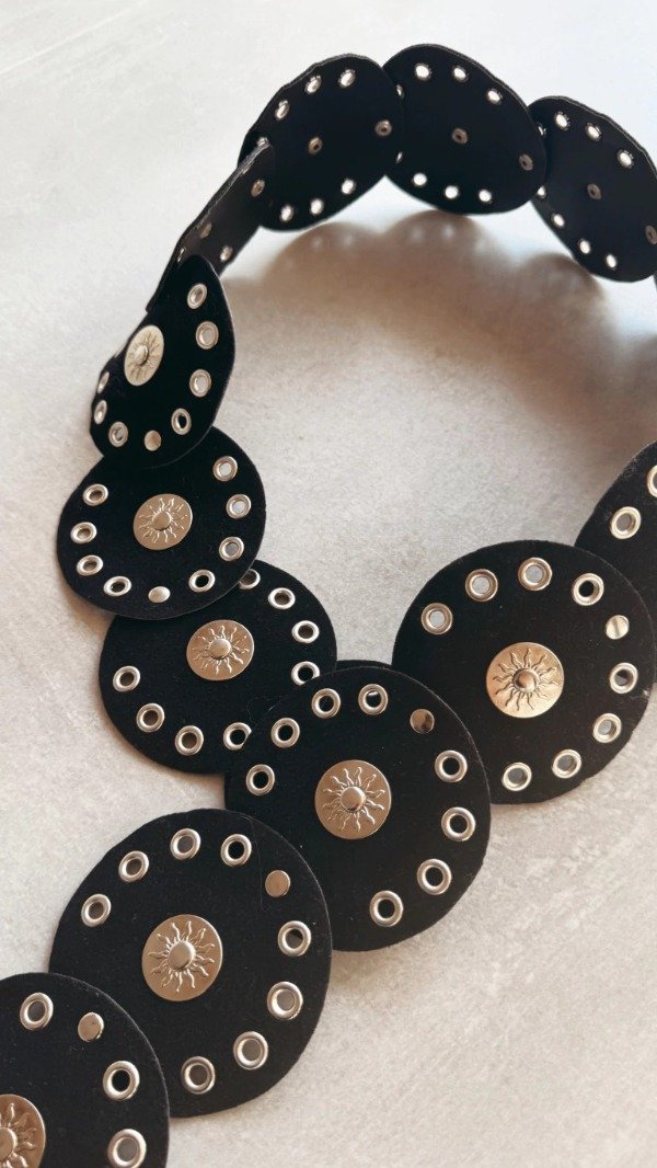 Cinto protagonista con arandelas circulares y detalle central estilo sol. Diseño impactante que realza la cintura y eleva cualquier outfit básico. Ideal para looks nocturnos o festivaleros.