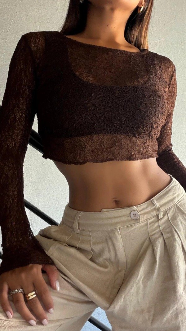 Top de manga larga confeccionado en encaje, con diseño al cuerpo y transparencias que aportan un estilo sensual y elegante. Su corte crop y textura delicada lo convierten en una prenda ideal para destacar cualquier look.