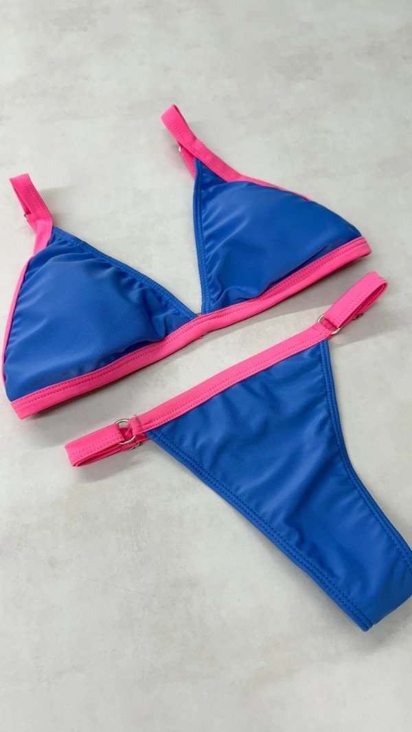 El Bikini Bicolor Azul / Fucsia es un modelo moderno, fresco y súper favorecedor, ideal para quienes buscan un diseño simple con un toque de color. Su corpiño triángulo regulable permite ajustar el calce según tu preferencia, mientras que la bombacha colaless regulable realza la figura y brinda comodidad.